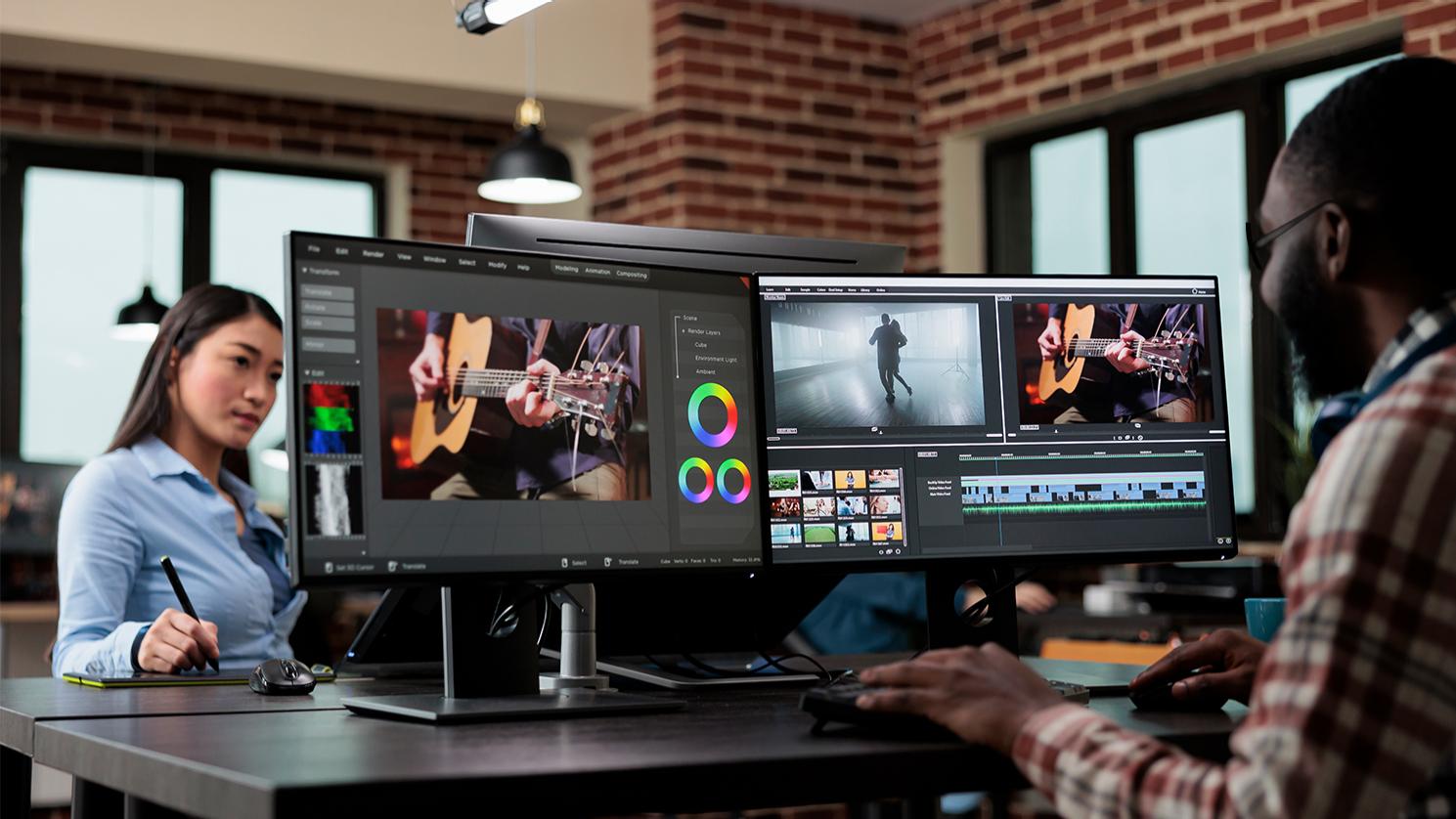 Una joven se sienta frente a un diseñador gráfico de mediana edad que lleva lentes para computador de ZEISS. Ambos están concentrados en las pantallas de sus computadores.