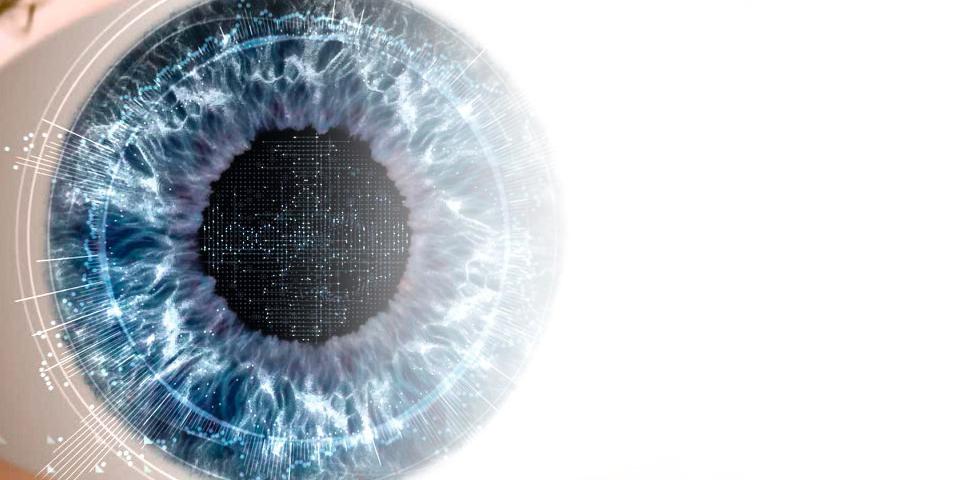 Primer plano del ojo de una mujer con efectos visuales, sobre fondo blanco